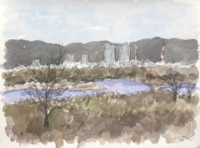 今年は描き初めが遅くなり、今日になった。5日前にも快晴だったが、健康管理のためジムに行ってしまい後悔した。この風景は、昨年からほぼ同じ場所から四季を描いてみようと思って続けてきて、一応4枚目が出来上がった。そんなに大層なことではないが、好きな風景だったので良かった。わが町枚方から見える淀川対岸の高槻市あたりの景色。いつものように自転車で私の住む牧野からとなりの御殿山あたりまで淀川を下ったところから描いたもの。気温は7度くらい、デッサン時から手がかじかんで参った。冬風景はやはり全体的に枯れて華やかさは無かったが、難しい冬色に挑戦出来ていい思い出になった。