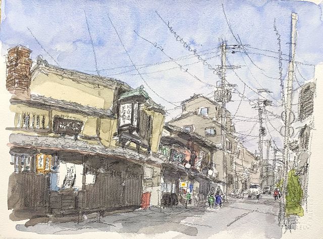 この日は、絵游会のスケッチ会で、京都市中京区界隈に来てみた。ここは、寺町通から姉小路通を少し西に入ったあたりで、老舗のお店や画材店が並んでいるところ。以前にも描いたことがあるが、こちら側からは初めてだった。天候は快晴で、暑いくらいの日差しになった。このあたりは、有名な旅館もあり、風情を感じる町屋もあって京都らしさが伝わってくる。観光客も少なく交通量もそんなに多くないので、落ち着いて描くことが出来た。今年1月末から展覧絵が続いて、スケッチが遠のいていたが、これから季節も良くなっていくので、顔晴って描いていきたいと思っています。よろしくお願いいたします。