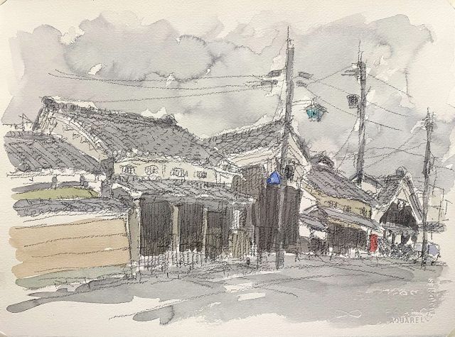この日は、ぐるーぷぐれいおぶぐれいのスケッチ会で、初めて亀岡市に来てみた。京都駅からJRで20分程度で亀岡駅に到着。午前中は散策しながらポイントを探し、最初は城下町自慢の二軒ある造り酒屋の一つ、「関酒造」あたりを描いた。美味しいオムライスでランチタイムにした後、午後は、町の中心の東に移動して、もう一つある造り酒屋の「丹山酒造」あたりに来てみた。右端に見えているのが丹山酒造だが、そこに行くまでの手前の町並に魅せられてしまい、先にここで一枚描くことにした。ここでも雨の心配もあるので、短時間に町屋風景を捉えて仕上げることにした。