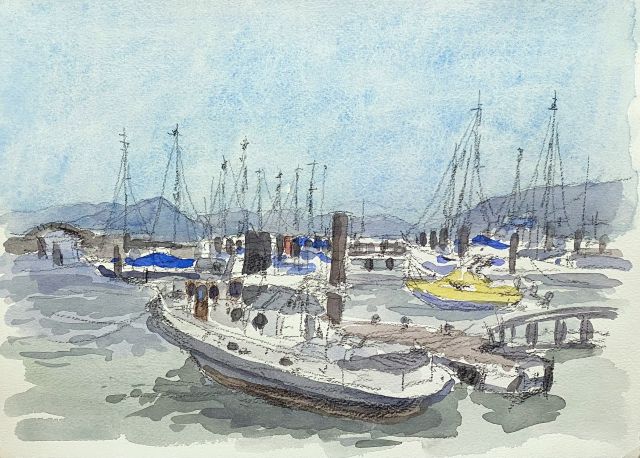 この日は、ぐるーぷぐれいおぶぐれいのスケッチ会で、1年半ぶりに滋賀県大津市浜大津に来てみた。午前中は、構図が見つからず、午後は、大津港に帰港してきた周遊する外輪船「ミシガン」を描いた。その後時間があったので、近くのヨットハーバーでもう一枚描くことにした。手前に一隻船があり、入れると絵になると思い、描いてみたが慣れないデッサンで上手くいかなかった。ヨットは整列して停泊しているので、殆ど見えなかったので、マストで存在感を現した現した。