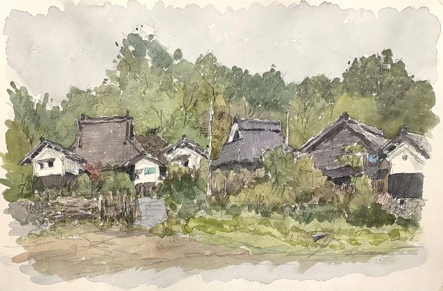 描き終えて : 花脊峠を後にして、折角なので足を延ばして美山かやぶきの里へ行くことにした。