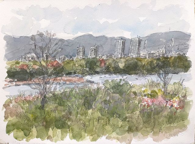この日は、朝思い立って、今年5月に描いた淀川の夏バージョンを描きたくなり行くことにした。我が家から淀川左岸を下流に向いて自転車で10分少々。ここは、枚方の御殿山あたりになるが、対岸には高槻市の駅前あたりのビル群を望むことが出来る。5月に比べると堤防の草も河川敷の草花や木々も成長して、周り一面まだ夏色のままで、淀川の水面は少し見えていた。暑さ対策として上下白の服装などにして、いつものように雰囲気だけを掴んで早く仕上げることにしたが、たまらなく暑く、汗が体中から噴き出してきて参った。ここは、自転車で走って見つけた風景で気に入っている。