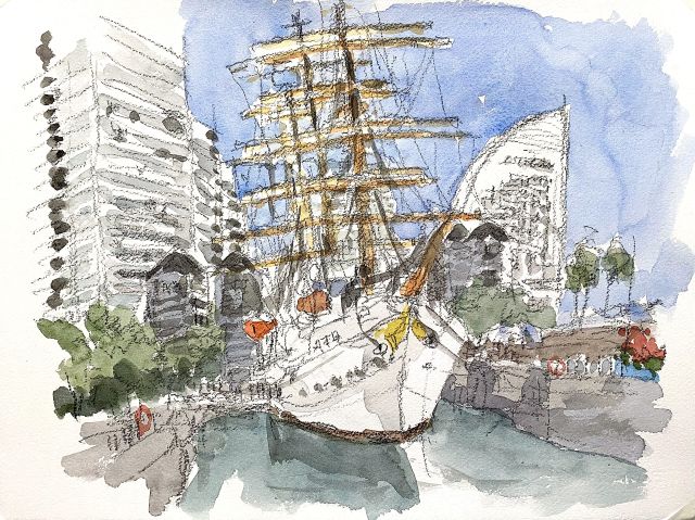 この時は、友人Eさんと京都から夜行バスで行き、早朝に着き、初めての横浜スケッチに胸を躍らせながら描いたことを覚えている。横浜は、観光スポット、モチーフもたくさんあり、最高だ。 |